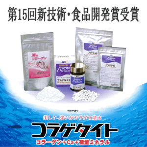 | 「コラゲタイト」は、日本国内で開発されたコラーゲンとカルシウムを主原料とした健康補助食品です。 食べやすい錠剤、また競走馬にも使われているコラゲタイト100%粉末もございます。 |