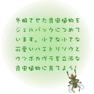 | 冬眠させた食虫植物をジェルパックにつめています。小さなかわいいハエトリソウとウツボカズラを立派な食虫植物に育ててください。 | |