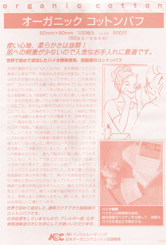 天然の素材からつくられたものは、自然環境にもひとの身体にも安全です。化粧品も天然成分を配合してよリ安心なものが使われるようになってきました。この風潮の中で、コットンパフも真っ白に漂白されていない自然のままのパフが欲しいという声が高まりました。調べてみると脱脂綿には「脱脂綿」と呼ぶための厳しい条件があり、水分の吸収に関して5gの綿が水中で8秒以内で完全に沈むこと。また5gの綿が20倍の10Ogの水分を保つことでした。 この条件をクリアするには、一般的に苛性ソ−ダや過酸化水素を使うのが簡単です。世界中のエコロジー商品を扱うメーカーに問い合わせましたが、これら以外で脱脂して製品化しているところはあリませんでした。 ところが「灯台元暗し」日本のメーカーで、すでに3年も前からバイオ精練で脱脂する研究をしている人達とめぐリ会いました。時代のニーズがなかったので研究成果として保管されていました。オーガニックコットンの熱意を伝えると、喜んで製品化に取リ組んでくれることになリ、そうしてでき上がったコットンパフは綿カスがポツポツ見えて、色はクリーム色で、いままでのコットンパフとはまるで別ものでした。従来の真っ白さは脱脂薬剤の漂白作用が働いて、綿カスも脱色されて白くなリ綿毛と見分けがつかなくなっていたのです。パイオ精練では漂白作用は起きませんので、綿カスがそのまま見えているのです。綿カスは葉や茎の破片ですから、安全上、使用上全く支障あリません。使い心地、柔らかさは従来品以上に優れています。 |