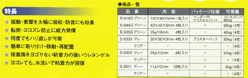 2.硬さ:アスラー硬度計で測つた硬さが15で有るスーパー吸ちやんより硬いものは15以上と成る。 3.熱伝導率:熱を1kcal加えると0.135伝わる。殆んど熱は伝えない。 4.圧縮応力:1Cuに0.33kgの重量が掛かると10%圧縮する。 5.引張永久伸び:10pをl5pまで伸ばした場合(50%の伸び)に、元に戻した時、2%元より長くなる。 6.引張りの強さ:1Cuを両サイドから引張って切れた時に、掛かった重さが14.9kgで有る。 7.伸び:両サイドから引張って、切断するまでの伸びが984%約10倍伸びる。 8.引裂強さ:1p巾にVカットされた物に、2.8kgの重量を掛けると引裂ける。 9.反発弾性:100のカを掛けた場合l2%反発する 10.応カ緩和:200%伸ばした時、100の力が必要で有つた場合に、1分後には、6.3%少ないカで、200%伸びた状態が保てる。 |