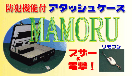 防犯機能付きアタッシュケース。ひったくりにあった場合、リモコン操作で警報ブザーと電流で撃退する。電流は10万ボルト。鞄に振動を与えると作動するので、置き引き対策にも良い。 |