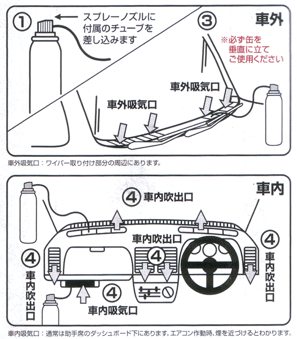 C続いてファンを止めて車内各送風ロにチューブを奥深くまで差込み1秒ずつ噴射します。また、車内吸気ロに噴射できる場合は同様に行ってください。※車種によって車内吸気口がわかりずらい場合があります。また、車内吸気口の下に電装品が有る場合原液が送風ダクトからたれて、悪影響を与える可能性がございますのでご注意ください。