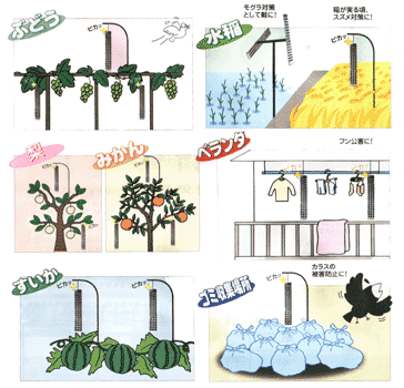風に揺れる本体が、太陽光に多彩に変化して鳥の学習能カ、いわゆる慣れを防ぎます。 ●汚れて反射がにぶくなったら、柔らかい布で傷が付かないように拭いて下さい。 ●取り付け場所は、畑作物は畑の中心に、ブドウ・梨などは棚下の周辺部に、リンゴ・柿などは樹の中心に設置すると効果的です。 ●長くお使い頂くために、使用しない時期には必ず取り外し、又、設置の際にはひもをしっかりと取り付け、十分安全を確かめた上でご使用下さい。 ●安全のため、使用期間中にひもの緩みなどの点検をして下さい。 |