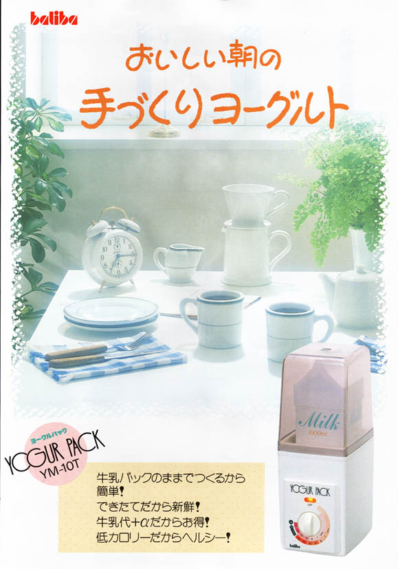 ●牛乳パツクで手軽につくれます 牛乳パックにヨーグルト菌または、市販のプレーンヨーグルトを少量入れて、ヨーグルパックにセットするだけの手軽さです。8〜11時間で新鮮なヨーグルトのできあがり。たとえば、おやすみ前にセットすれば朝食に、おでかけ前にセットすれば夕食においしく召し上がれます。できあがったヨーグルトは、パックのまま冷蔵庫で冷やしてください。 ●市販のヨーグルトより経済的。 ヨーグルトにするための1回の必要経費は牛乳代ブラス電気代(4〜6円)ですから、市販のヨーグルトの約半分で済みます。また、1度つくったヨーグルトを種菌にしてヨーグルトをつくることができます。 ●味わい、いろいろ自分流 タイマーのセット時問を短かくすればマイルドな味に。長くすれば発酵が進みすっぱいヨーグルトができます。お好みに合せ時間をセットしてください。さらに、ジャムやフルーツ、砂糖を加えてヨーグルトデザートに!氷水、レモン、ジュースを入れればドリンクヨーグルト。肉料理のソース、シチュー、カレーに入れたり、酢と合せてサラダドレッシングに。お料理のレパートリーを自分流に広げてみては! ●ヨーグルト菌は約45℃のときが発酵するのに最も条件の良い温度。これを利用しだのがヨーグルパックです。しかも市販の牛乳は高温で完全殺菌していますので、雑菌の繁殖に神経を使うことかなく衛生的です。さらに使用前後にヨーグルパックを洗浄・消毒をするといった必要はありません。 ●こんな方にヨーグルトをおすすめします。胃腸の弱い方/下痢・便秘がちの方/高コレステロール・糖尿・肝臓などが気になる方。もちろん美容には最適なへルシーフーズです。 |